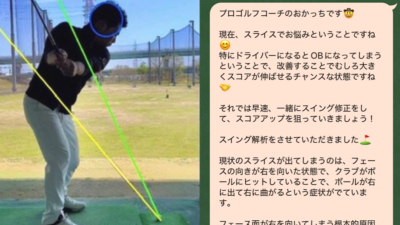 スイング動画をLINEで送信するだけで、おかっち先生が直接レッスン内容を返信いたします。(初心者から上級者まで受講いただけます。)
